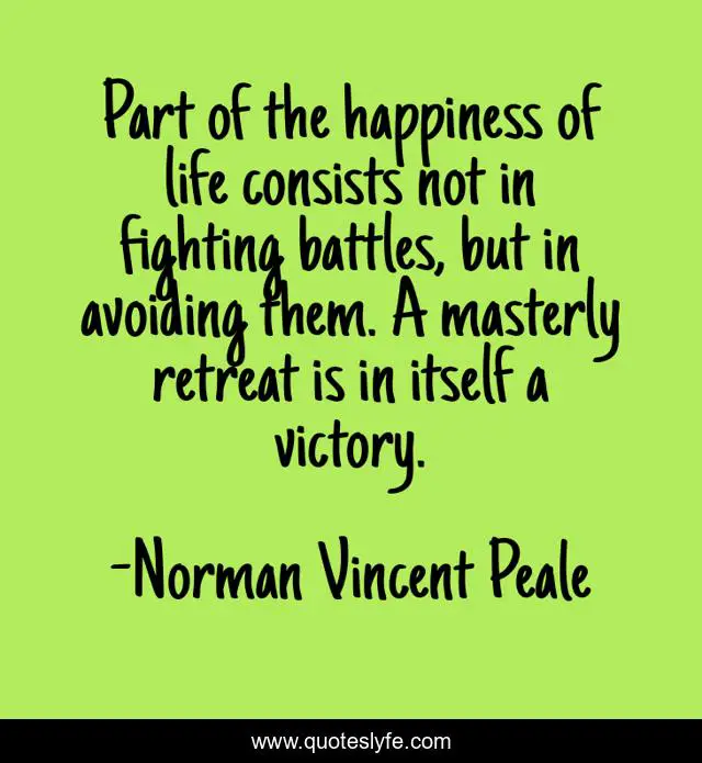 This page presents the quote "Part of the happiness of life consists not in fighting battles, but in avoiding them. A masterly retreat is in itself a victory.". Author of this quote is Norman Vincent Peale. This quote is about battle, enthusiasm, inspirational, retreat, victory,.