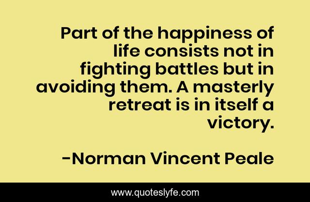 This page presents the quote "Part of the happiness of life consists not in fighting battles but in avoiding them. A masterly retreat is in itself a victory.". Author of this quote is Norman Vincent Peale. .