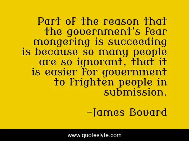 This page presents the quote "Part of the reason that the government's fear mongering is succeeding is because so many people are so ignorant, that it is easier for government to frighten people in submission.". Author of this quote is James Bovard. This quote is about government, ignorant, people,.