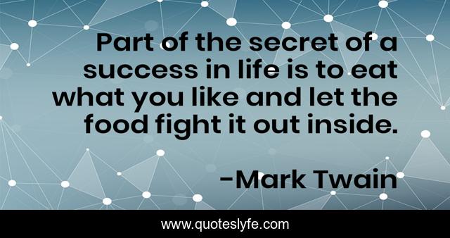 This page presents the quote "Part of the secret of a success in life is to eat what you like and let the food fight it out inside.". Author of this quote is Mark Twain. This quote is about life, success, fight,.