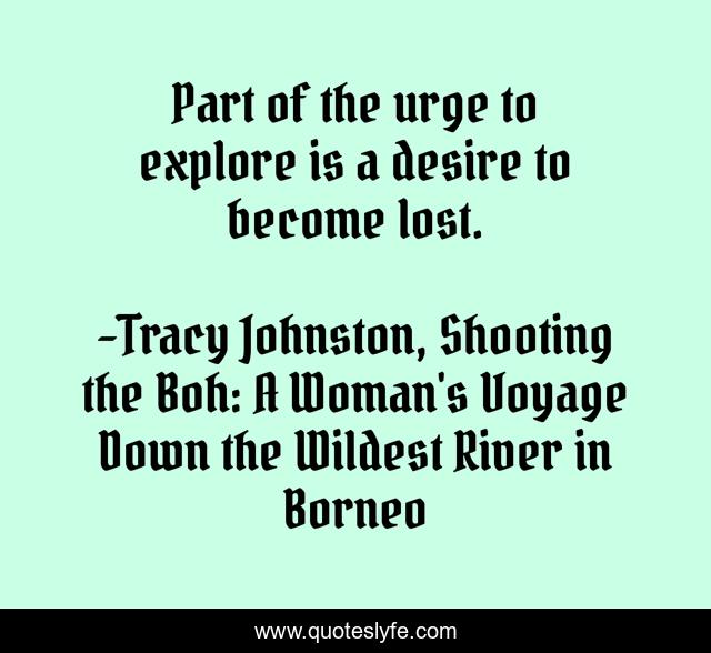 This page presents the quote "Part of the urge to explore is a desire to become lost.". Author of this quote is Tracy Johnston, Shooting the Boh: A Woman's Voyage Down the Wildest River in Borneo. This quote is about travel, exploration, adventure, lost,.