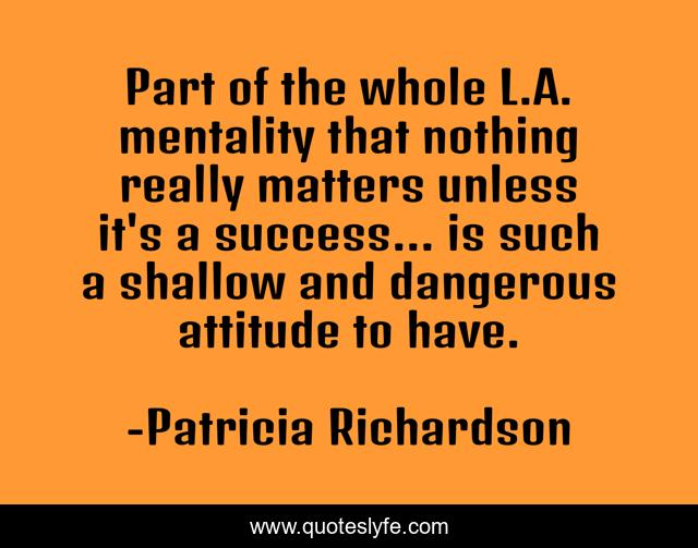 This page presents the quote "Part of the whole L.A. mentality that nothing really matters unless it's a success... is such a shallow and dangerous attitude to have.". Author of this quote is Patricia Richardson. This quote is about nothing, matters, success,.