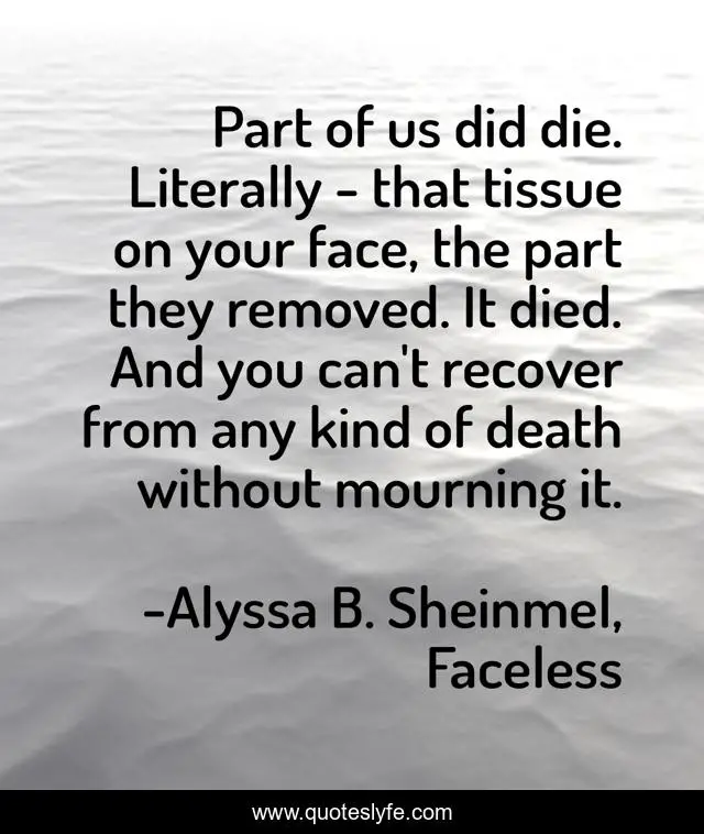 This page presents the quote "Part of us did die. Literally - that tissue on your face, the part they removed. It died. And you can't recover from any kind of death without mourning it.". Author of this quote is Alyssa B. Sheinmel, Faceless. This quote is about death, death-and-sickness, transplants, mourning, death-and-dying, transplant,.