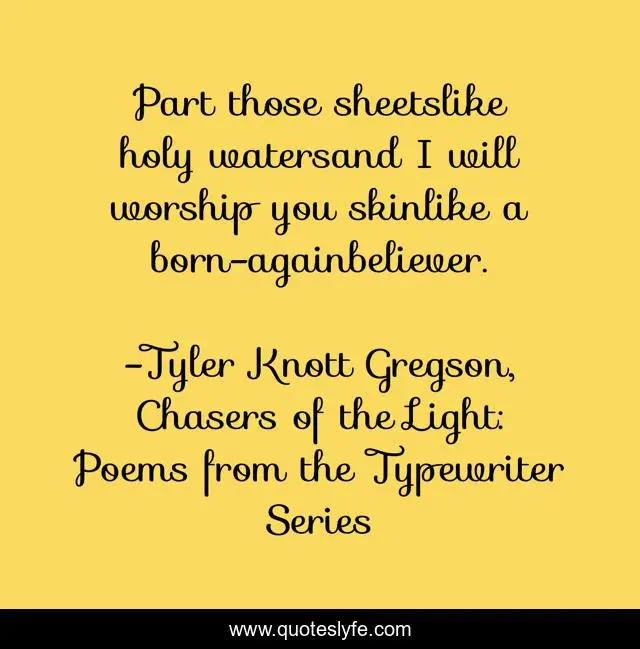 This page presents the quote "Part those sheetslike holy watersand I will worship you skinlike a born-againbeliever.". Author of this quote is Tyler Knott Gregson, Chasers of the Light: Poems from the Typewriter Series. This quote is about desire, love, worship, affection,.