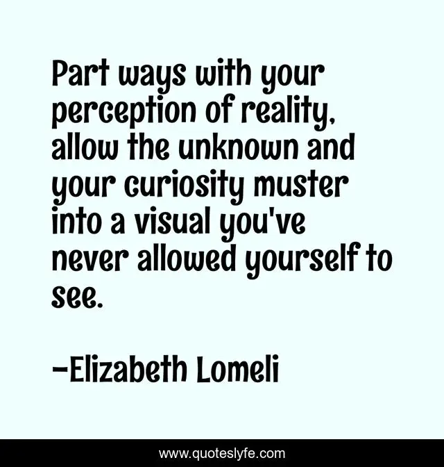 This page presents the quote "Part ways with your perception of reality, allow the unknown and your curiosity muster into a visual you've never allowed yourself to see.". Author of this quote is Elizabeth Lomeli. This quote is about mystery, perception, unknown, reality, curiosity, vision,.