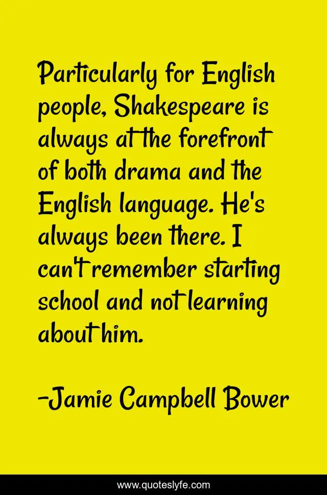 This page presents the quote "Particularly for English people, Shakespeare is always at the forefront of both drama and the English language. He's always been there. I can't remember starting school and not learning about him.". Author of this quote is Jamie Campbell Bower. This quote is about school, remember, language,.
