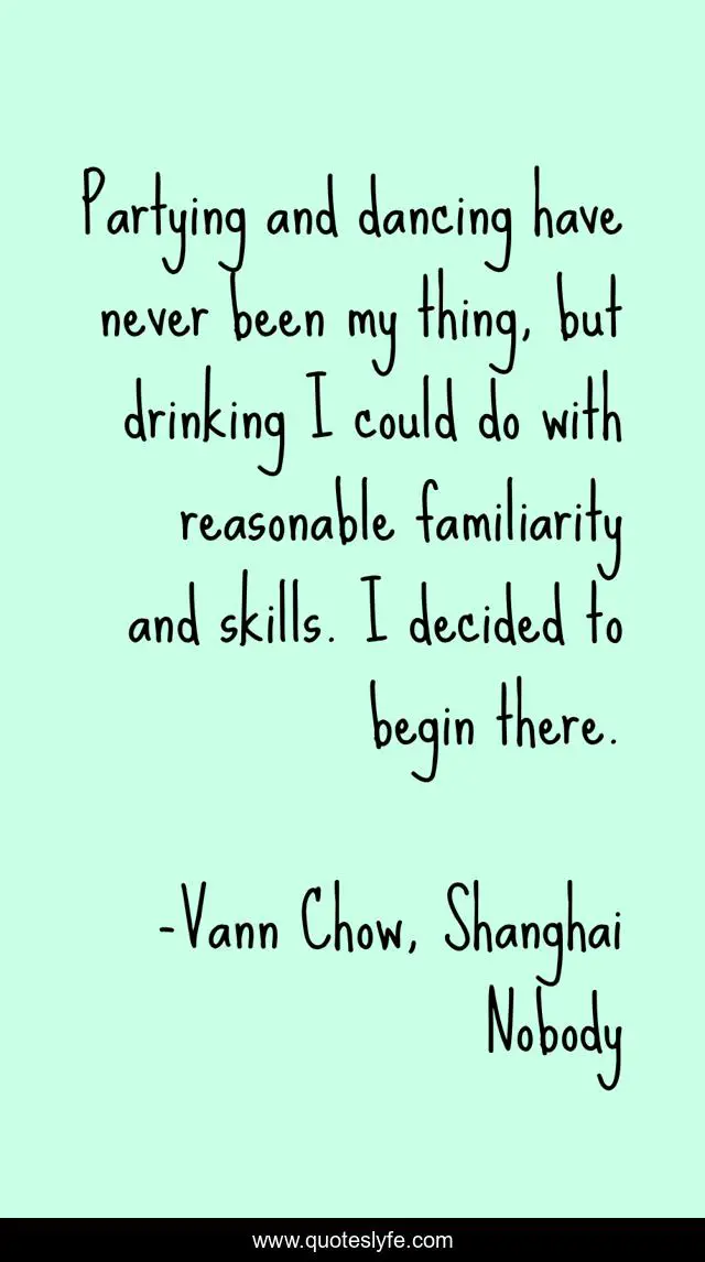 This page presents the quote "Partying and dancing have never been my thing, but drinking I could do with reasonable familiarity and skills. I decided to begin there.". Author of this quote is Vann Chow, Shanghai Nobody. This quote is about meeting-girls, dating, partying, coming-of-age, beers, party, drinking, drinking-alcohol,.
