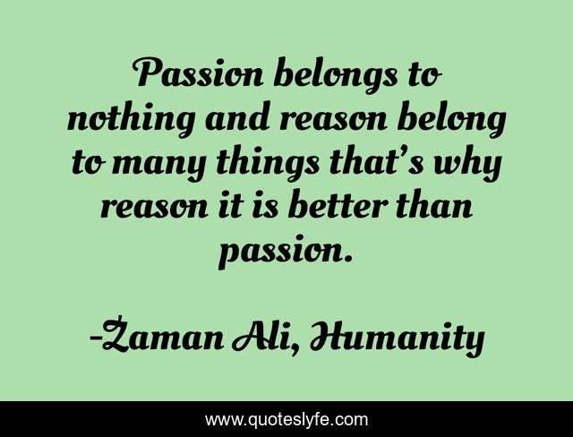 This page presents the quote "Passion belongs to nothing and reason belong to many things that’s why reason it is better than passion.". Author of this quote is Zaman Ali, Humanity. This quote is about many, belong, better, reason, passion, nothing,.