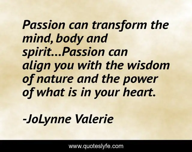 This page presents the quote "Passion can transform the mind, body and spirit...Passion can align you with the wisdom of nature and the power of what is in your heart.". Author of this quote is JoLynne Valerie. This quote is about body, mind, empowerment, passion, spirit,.