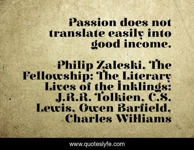This page presents the quote "Passion does not translate easily into good income.". Author of this quote is Philip Zaleski, The Fellowship: The Literary Lives of the Inklings: J.R.R. Tolkien, C.S. Lewis, Owen Barfield, Charles Williams. This quote is about calling, job, temperament, hobby, vocation, amusement,.