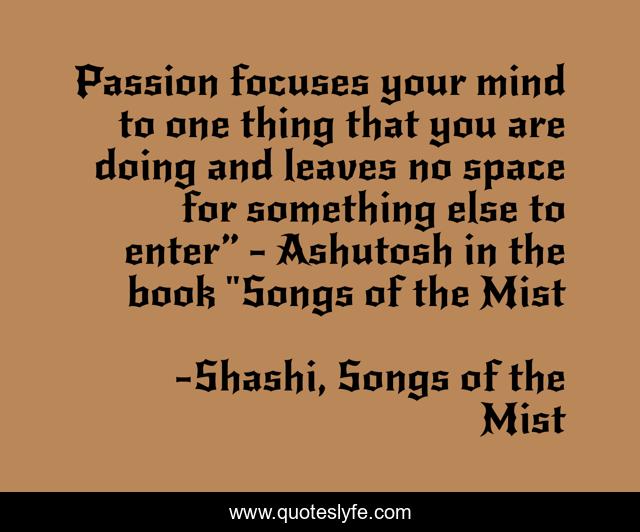 This page presents the quote "Passion focuses your mind to one thing that you are doing and leaves no space for something else to enter” - Ashutosh in the book "Songs of the Mist". Author of this quote is Shashi, Songs of the Mist. This quote is about spirituality, self-help,.