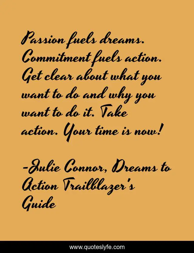 This page presents the quote "Passion fuels dreams. Commitment fuels action. Get clear about what you want to do and why you want to do it. Take action. Your time is now!". Author of this quote is Julie Connor, Dreams to Action Trailblazer's Guide. This quote is about motivation, goal, plan, action, dream, inspiration,.