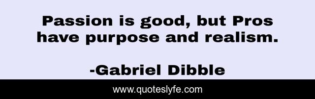 This page presents the quote "Passion is good, but Pros have purpose and realism.". Author of this quote is Gabriel Dibble. This quote is about passion, purpose, realism,.