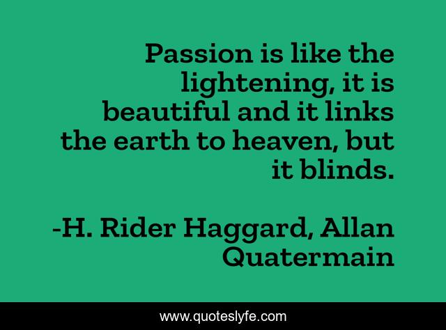 This page presents the quote "Passion is like the lightening, it is beautiful and it links the earth to heaven, but it blinds.". Author of this quote is H. Rider Haggard, Allan Quatermain. This quote is about lightening, passion,.