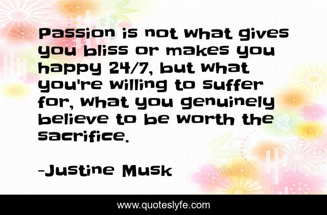 This page presents the quote "Passion is not what gives you bliss or makes you happy 24/7, but what you're willing to suffer for, what you genuinely believe to be worth the sacrifice.". Author of this quote is Justine Musk. This quote is about enthusiasm, truth-of-life, passion, inspirational,.