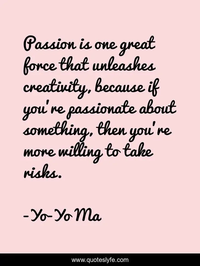 This page presents the quote "Passion is one great force that unleashes creativity, because if you're passionate about something, then you're more willing to take risks.". Author of this quote is Yo-Yo Ma. This quote is about creativity, passion, risks,.