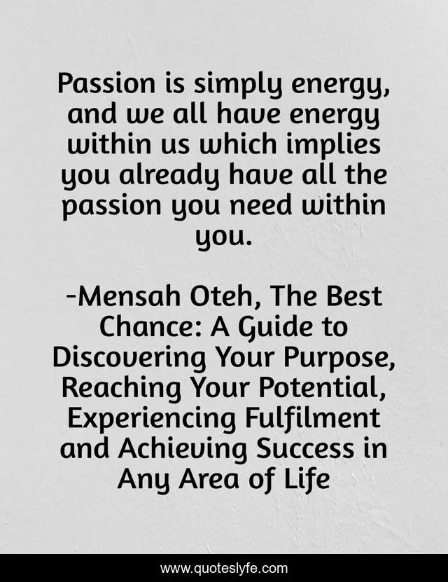 "Mensah Oteh, The Best Chance: A Guide to Discovering Your Purpose, Reaching Your Potential, Experiencing Fulfilment and Achieving Success in Any Area of Life Quotes." Quoteslyfe.com, 2025. Sat. 06 Dec. 2025. <https://www.quoteslyfe.com/quote/Passion-is-simply-energy-and-we-all-49051>.
