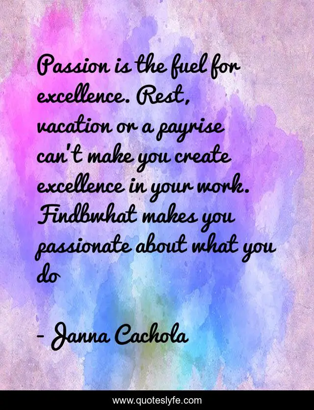 This page presents the quote "Passion is the fuel for excellence. Rest, vacation or a payrise can't make you create excellence in your work. Findbwhat makes you passionate about what you do". Author of this quote is Janna Cachola. This quote is about motivation, leaderaship, passion, determination, excellence, inspiration, intentional, team-builder,.