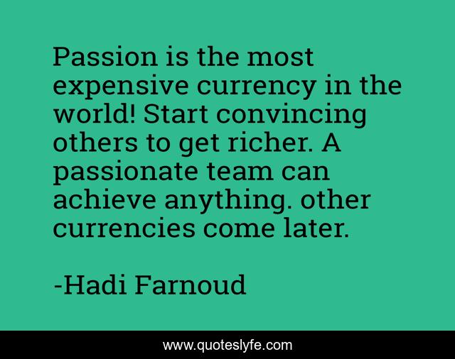 This page presents the quote "Passion is the most expensive currency in the world! Start convincing others to get richer. A passionate team can achieve anything. other currencies come later.". Author of this quote is Hadi Farnoud. This quote is about entrepreneur, startups, entrepreneurship,.