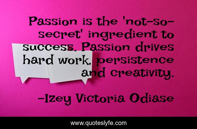 This page presents the quote "Passion is the 'not-so-secret' ingredient to success. Passion drives hard work, persistence and creativity.". Author of this quote is Izey Victoria Odiase. This quote is about life, success, passionate-living, succeeding-in-life, successful-people, success-in-life, succeed, passion, success-in-business,.