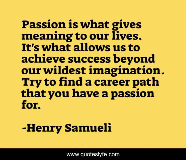 This page presents the quote "Passion is what gives meaning to our lives. It's what allows us to achieve success beyond our wildest imagination. Try to find a career path that you have a passion for.". Author of this quote is Henry Samueli. This quote is about path, passion, success,.