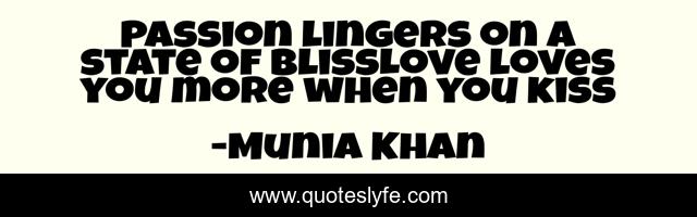 This page presents the quote "Passion lingers on a state of blissLove loves you more when you kiss". Author of this quote is Munia Khan. This quote is about kissing, lovers, love, romantic, linger, kisses, poetry, more, state,.