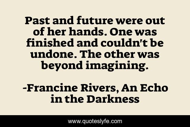 This page presents the quote "Past and future were out of her hands. One was finished and couldn't be undone. The other was beyond imagining.". Author of this quote is Francine Rivers, An Echo in the Darkness. This quote is about past, finished, future,.