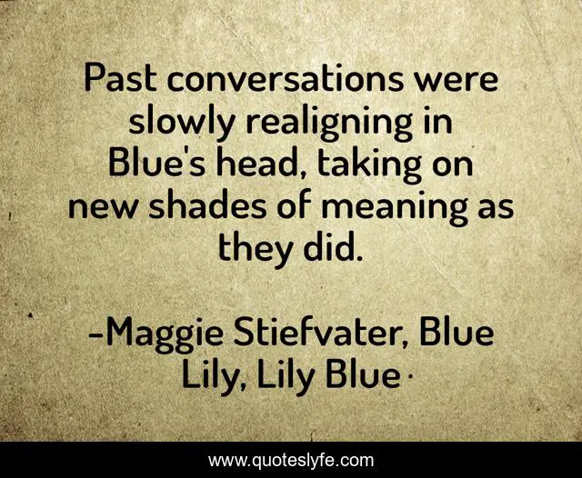 "Maggie Stiefvater, Blue Lily, Lily Blue Quotes." Quoteslyfe.com, 2025. Sun. 07 Dec. 2025. <https://www.quoteslyfe.com/quote/Past-conversations-were-slowly-realigning-in-Blue-258094>.