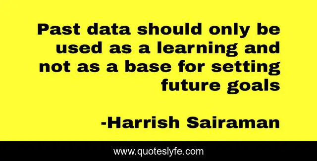 This page presents the quote "Past data should only be used as a learning and not as a base for setting future goals". Author of this quote is Harrish Sairaman. This quote is about confidence, learning, future-goals, positive, motivational, past, future, optimistic, inspirational,.