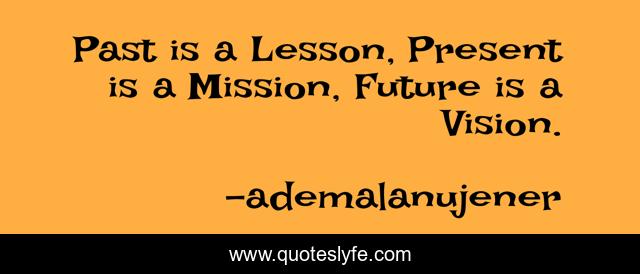 This page presents the quote "Past is a Lesson, Present is a Mission, Future is a Vision.". Author of this quote is ademalanujener. This quote is about life, principles, laws,.