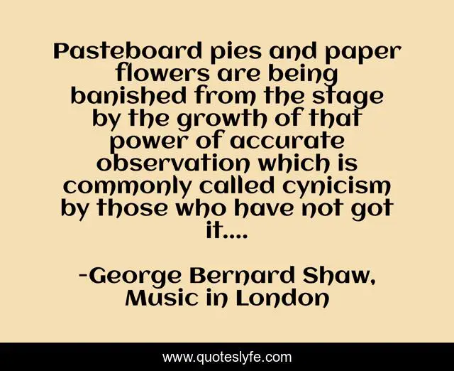 This page presents the quote "Pasteboard pies and paper flowers are being banished from the stage by the growth of that power of accurate observation which is commonly called cynicism by those who have not got it....". Author of this quote is George Bernard Shaw, Music in London. .