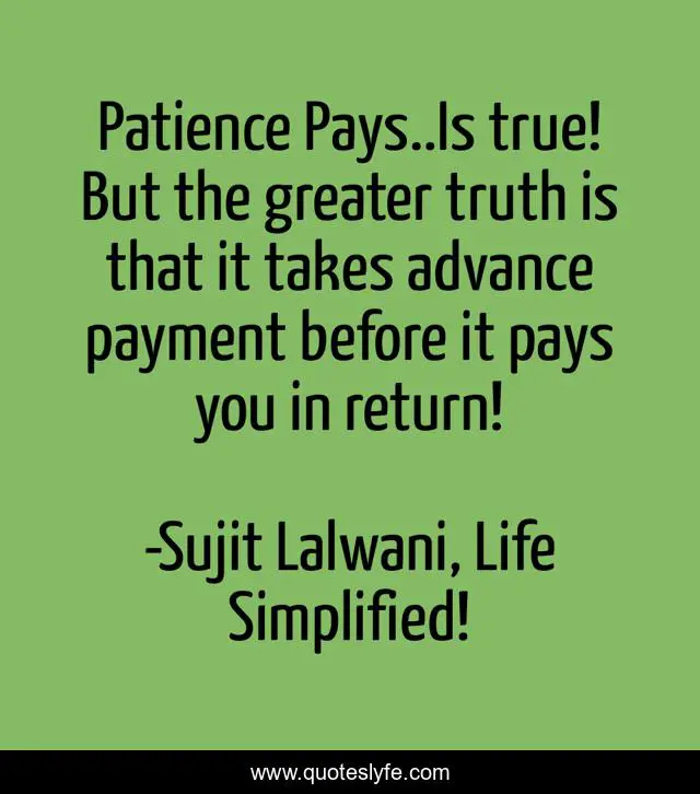 This page presents the quote "Patience Pays..Is true! But the greater truth is that it takes advance payment before it pays you in return!". Author of this quote is Sujit Lalwani, Life Simplified!. This quote is about life, inspirational, moivational, life-lessons, enthusiasm, inspiration,.