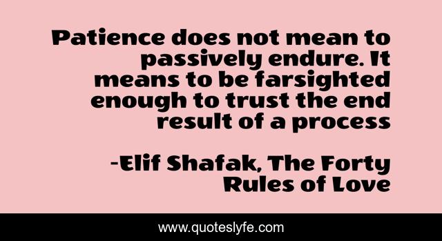 This page presents the quote "Patience does not mean to passively endure. It means to be farsighted enough to trust the end result of a process". Author of this quote is Elif Shafak, The Forty Rules of Love. This quote is about patience, virtue,.