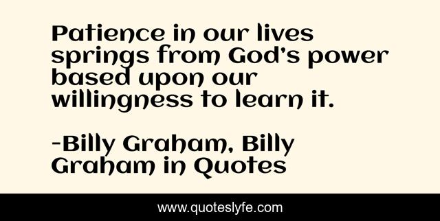 This page presents the quote "Patience in our lives springs from God’s power based upon our willingness to learn it.". Author of this quote is Billy Graham, Billy Graham in Quotes. This quote is about patience, billy-graham,.