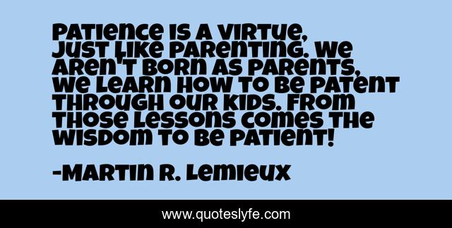 This page presents the quote "Patience is a virtue, just like parenting. We aren't born as parents, we learn how to be patent through our kids. From those lessons comes the wisdom to be patient!". Author of this quote is Martin R. Lemieux. This quote is about patience, kids, patient, patience-and-love,.