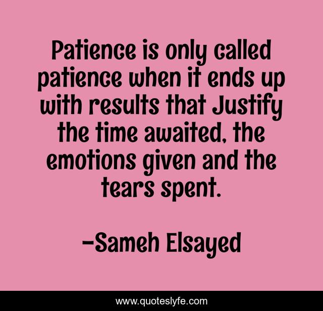 This page presents the quote "Patience is only called patience when it ends up with results that Justify the time awaited, the emotions given and the tears spent.". Author of this quote is Sameh Elsayed. This quote is about experience-plus, noha-abdel-hameed, adam-elsayedtodd, emotions, patience, tears, joumana-ezz, human-development, time,.