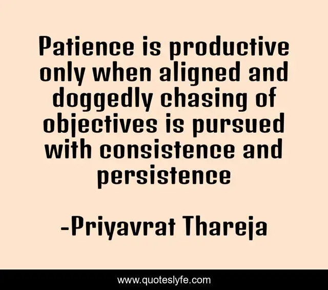 This page presents the quote "Patience is productive only when aligned and doggedly chasing of objectives is pursued with consistence and persistence". Author of this quote is Priyavrat Thareja. This quote is about patience, productive, persistence,.
