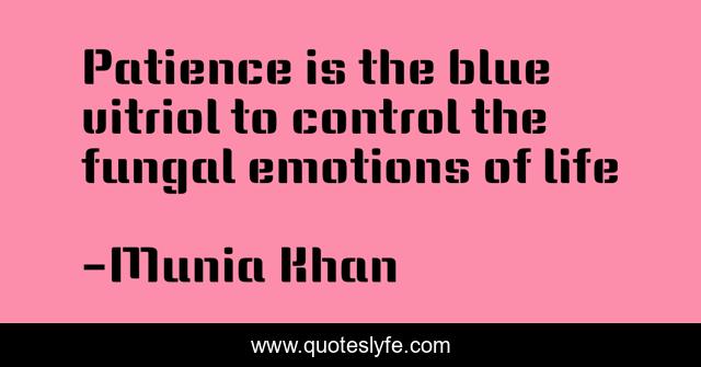This page presents the quote "Patience is the blue vitriol to control the fungal emotions of life". Author of this quote is Munia Khan. This quote is about blue, emotion, life, fungal, vitriol, life-lessons, blue-vitriol, emotions, wisdom,.