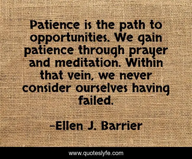 This page presents the quote "Patience is the path to opportunities. We gain patience through prayer and meditation. Within that vein, we never consider ourselves having failed.". Author of this quote is Ellen J. Barrier. This quote is about patience, opportunities, prayer,.