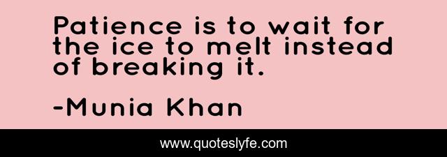 This page presents the quote "Patience is to wait for the ice to melt instead of breaking it.". Author of this quote is Munia Khan. This quote is about melting, wise-words, patient, breaking, snow, melt, patient-in-life, patience, waiting,.