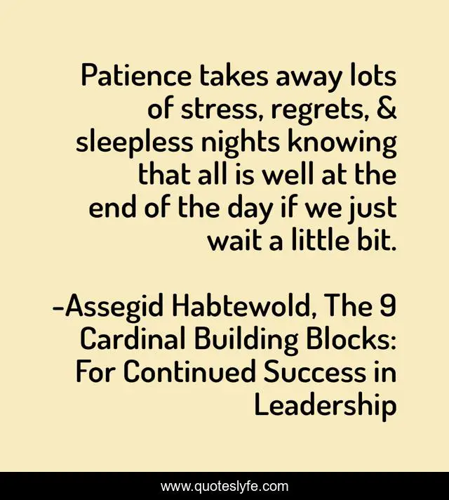 "Assegid Habtewold, The 9 Cardinal Building Blocks: For Continued Success in Leadership Quotes." Quoteslyfe.com, 2025. Tue. 09 Dec. 2025. <https://www.quoteslyfe.com/quote/Patience-takes-away-lots-of-stress-regrets-193138>.