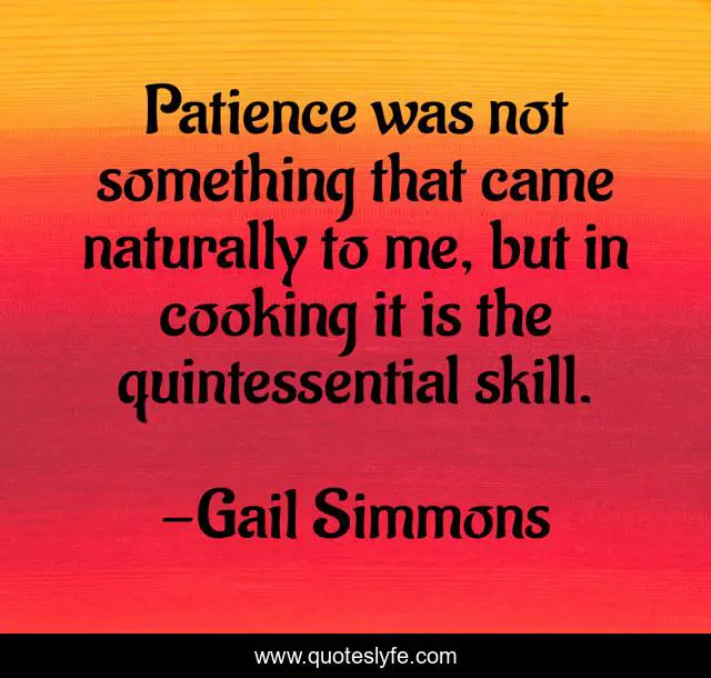 This page presents the quote "Patience was not something that came naturally to me, but in cooking it is the quintessential skill.". Author of this quote is Gail Simmons. This quote is about me, skill, cooking,.