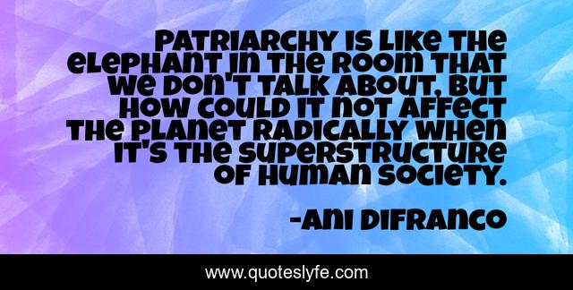 This page presents the quote "Patriarchy is like the elephant in the room that we don't talk about, but how could it not affect the planet radically when it's the superstructure of human society.". Author of this quote is Ani DiFranco. This quote is about human, talk, elephant,.