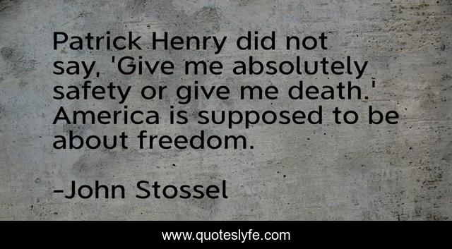 This page presents the quote "Patrick Henry did not say, 'Give me absolutely safety or give me death.' America is supposed to be about freedom.". Author of this quote is John Stossel. This quote is about freedom, america, safety,.
