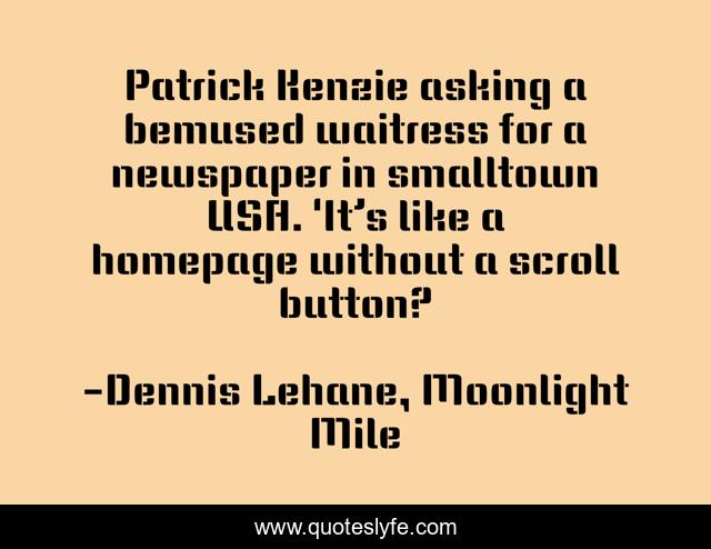 "Dennis Lehane, Moonlight Mile Quotes." Quoteslyfe.com, 2025. Sat. 06 Dec. 2025. <https://www.quoteslyfe.com/quote/Patrick-Kenzie-asking-a-bemused-waitress-for-250704>.