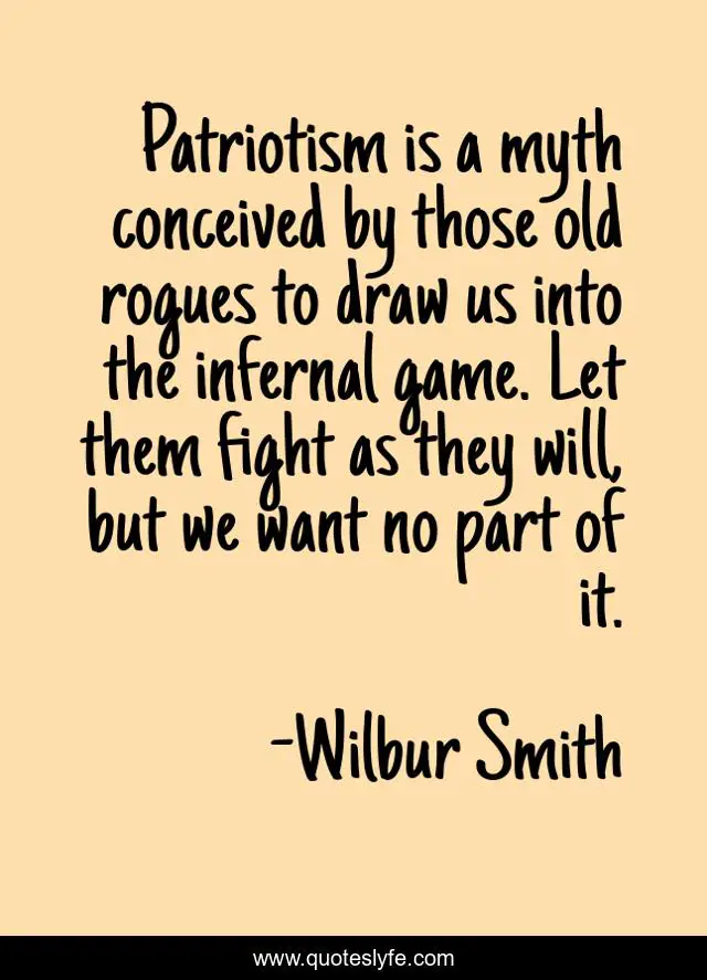 This page presents the quote "Patriotism is a myth conceived by those old rogues to draw us into the infernal game. Let them fight as they will, but we want no part of it.". Author of this quote is Wilbur Smith. .