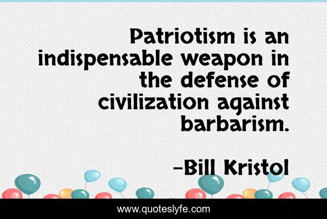 This page presents the quote "Patriotism is an indispensable weapon in the defense of civilization against barbarism.". Author of this quote is Bill Kristol. This quote is about civilization, defense,.