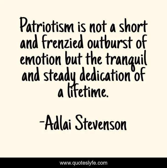 This page presents the quote "Patriotism is not a short and frenzied outburst of emotion but the tranquil and steady dedication of a lifetime.". Author of this quote is Adlai Stevenson. This quote is about dedication, emotion, short,.