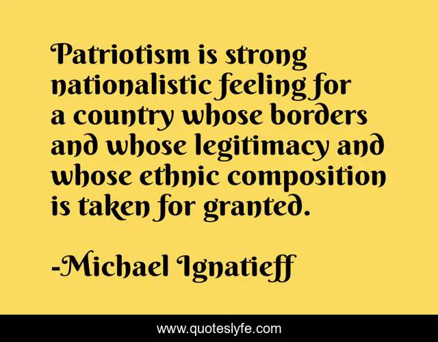 This page presents the quote "Patriotism is strong nationalistic feeling for a country whose borders and whose legitimacy and whose ethnic composition is taken for granted.". Author of this quote is Michael Ignatieff. This quote is about country, feeling, strong,.