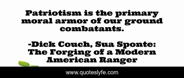 This page presents the quote "Patriotism is the primary moral armor of our ground combatants.". Author of this quote is Dick Couch, Sua Sponte: The Forging of a Modern American Ranger. This quote is about combat-infantry, patriotism, combat,.